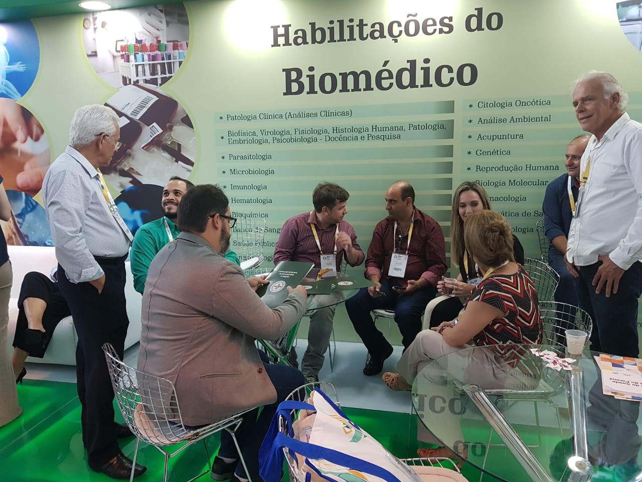No estande da Biomedicina, Dra. Janaina Naumann, Presidente do CRBM6, discute sobre a importância da Profissão.