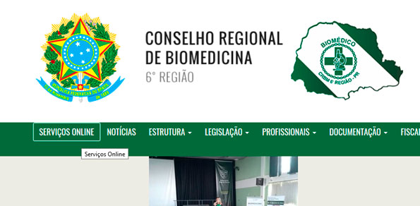 1) Acesse serviços online – Espaço do Biomédicona página inicial do site do CRBM6, https://crbm6.gov.br/ , aba de SERVIÇOS ON LINE: