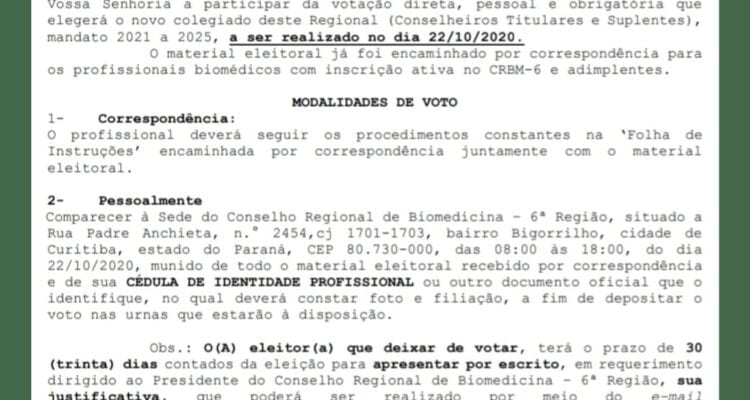 Prezado(a) biomédico(a) atente-se aos procedimentos relacionados ao processo eleitoral do CRBM-6. Caso haja dúvida, por gentileza encaminhe e-mail para eleicao@crbm6.gov.br