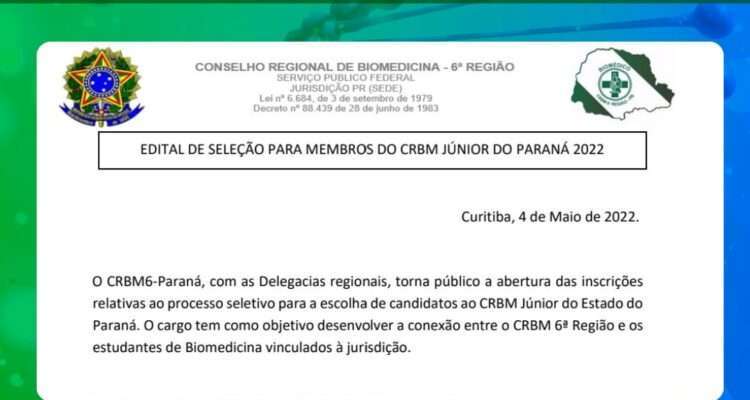 Atenção acadêmicos de Biomedicina! Está aberto o Edital para o CRBM Júnior do PR 2022. Inscrições são gratuitas e vão
